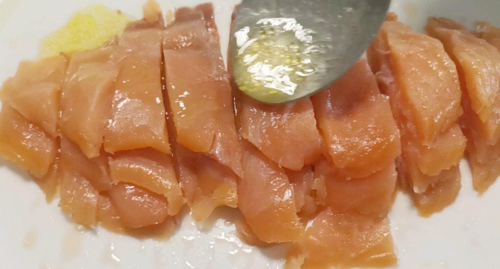 Bereid nu de zalm voor. Als je gerookte zalmplakjes zoals ik hebt gekocht, leg ze op elkaar en snijd ze dan horizontaal in plakken van ongeveer 1,5 cm breed. Breng op smaak met de resterende citronette en peper, laat de smaken intrekken.