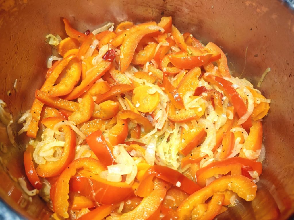 Bereid eerst de groenten voor. Snijd de paprika in reepjes, de uien en wortels in plakjes, pers dan de knoflook en snijd de chilipeper in stukken.