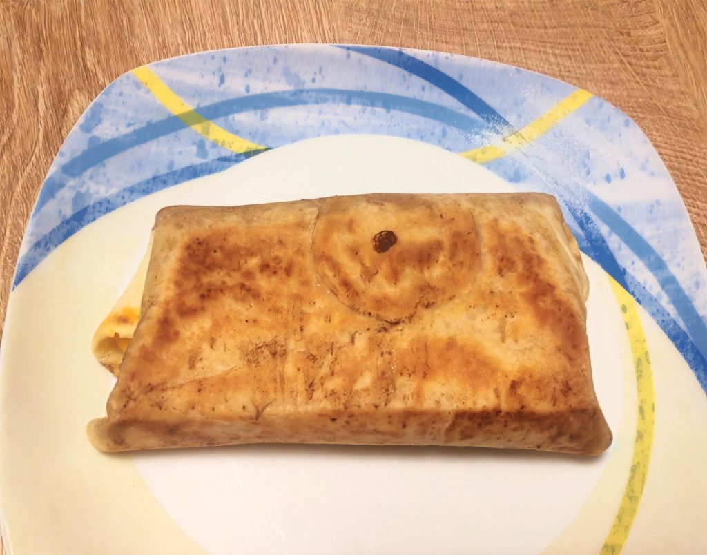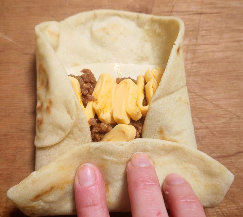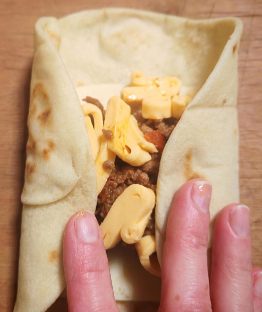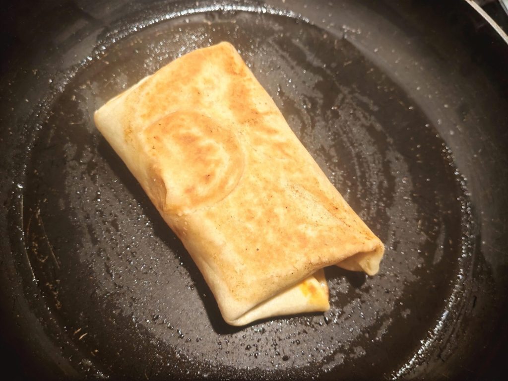 Voltooi nu met een lichte toast. Doe een klontje boter in de pan, verwarm goed, leg de burrito erin en laat hem aan alle kanten goudbruin worden, zodat de kazen erin ook smelten.