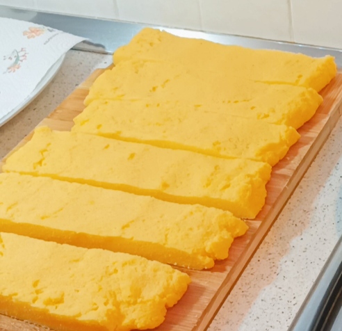 Laat het ongeveer 2 uur rusten. Ik maakte het ’s ochtends klaar en frituurde het ’s avonds. Na de rusttijd snijd je het in verticale stroken van ongeveer 6 cm breed.