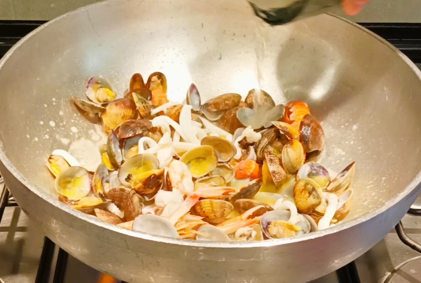 Wanneer de pasta gaar is, zet de zeevruchten terug op het vuur en voeg een soeplepel kookwater toe.