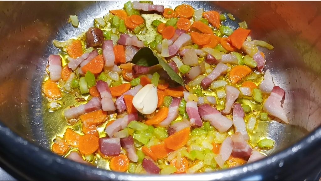 Doe een beetje olie in de pan, net genoeg om de bodem te bedekken, verwarm op laag vuur en voeg de groenten, knoflook, laurierblad en spek toe. Laat ongeveer 5 minuten zachtjes bakken, totdat de groenten zacht zijn.