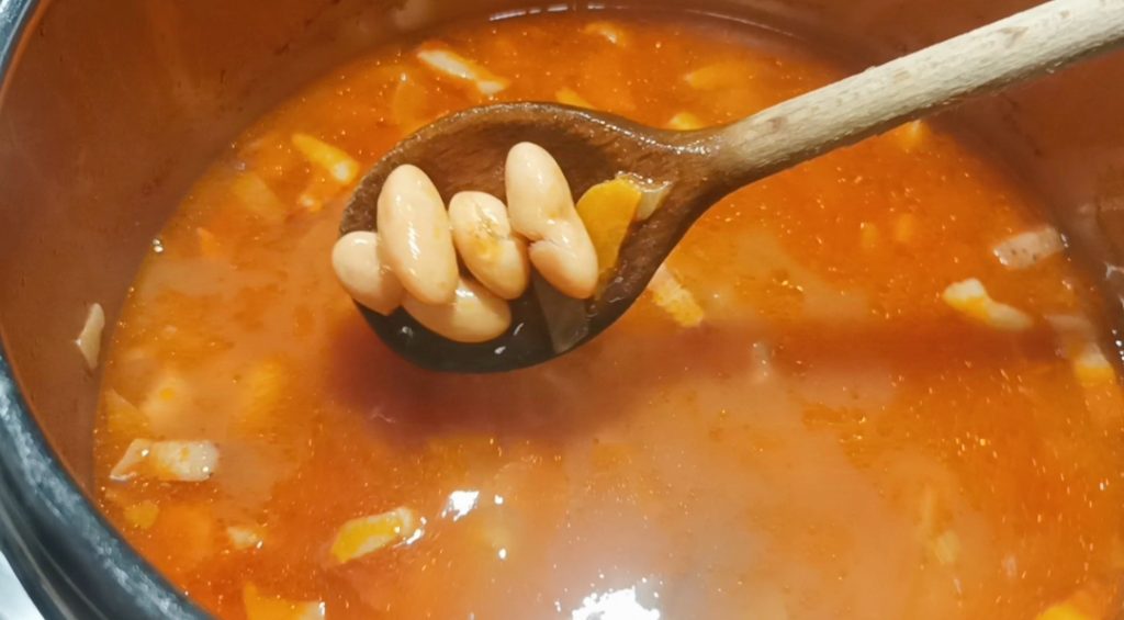 Na de kooktijd zet je het vuur uit en laat je eerst alle stoom via het ventiel ontsnappen voordat je de pan opent. De borlottibonen zijn nu klaar en je kunt verdergaan met het koken van de pasta.