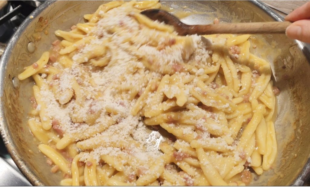 • Giet het af en doe het in de pan met de saus, voeg een soeplepel bouillon en de geraspte Parmezaan toe. Meng alles goed door met de bouillon de juiste romigheid te geven.