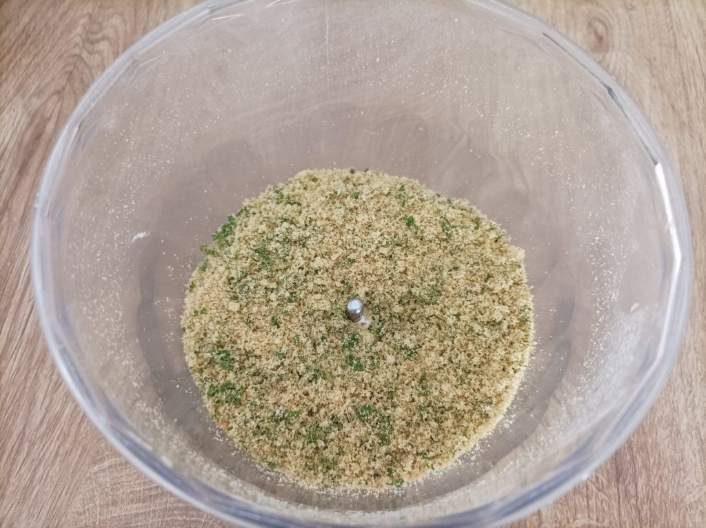 In de tussentijd bereid je het mengsel met paneermeel, zout, peper, knoflook en peterselie.