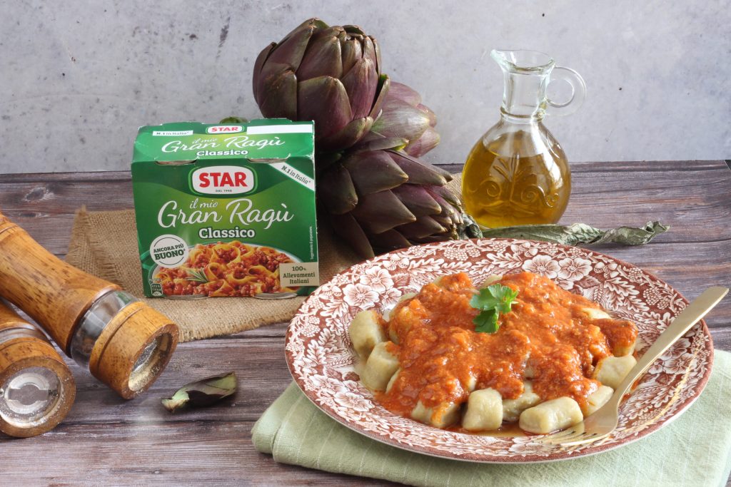 Zodra je deze procedure hebt voltooid, giet je twee potten Mio Gran Ragù Star Classico over de gnocchi en laat je de ingrediënten mengen. Wanneer alles goed gemengd is, serveer dan de artisjokgnocchi met ragù goed warm, met een snufje parmezaan of pecorino.