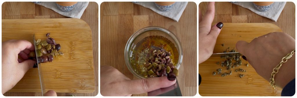 Hak ook de taggiasca olijven en kappertjes. Voeg alles toe aan de pot.