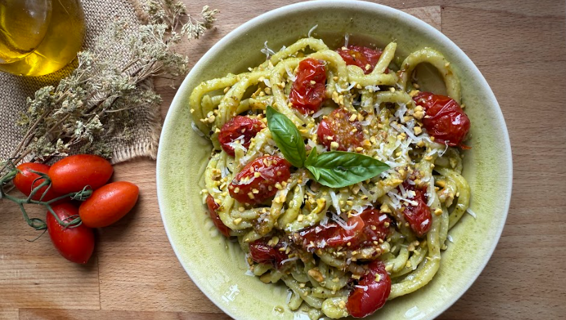 De pasta met pistachepesto en gekonfijte tomaatjes is een rijk en geurig hoofdgerecht, dat de romigheid van pistache combineert met de zoete en intense smaak van tomaatjes die in de airfryer zijn bereid. Een perfecte smaakcombinatie om gasten te verrassen of jezelf te verwennen met een speciaal maar eenvoudig te bereiden gerecht.