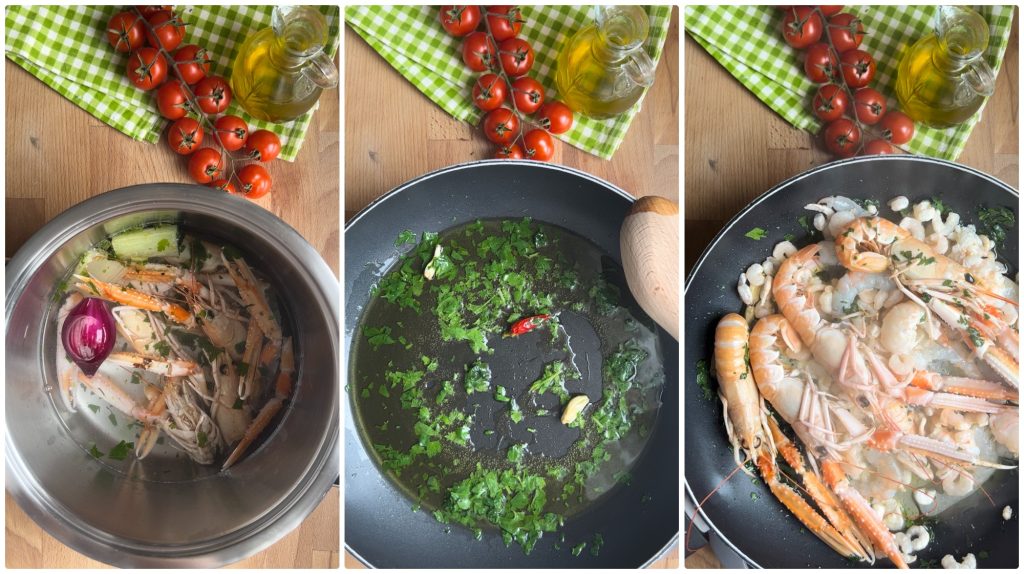 • Voor de bereiding van de Pasta met saus van Diepgevroren Noorse Kreeftjes en Garnalen is de eerste stap om de Noorse kreeftjes te behandelen.