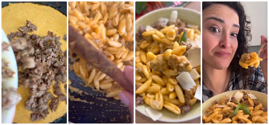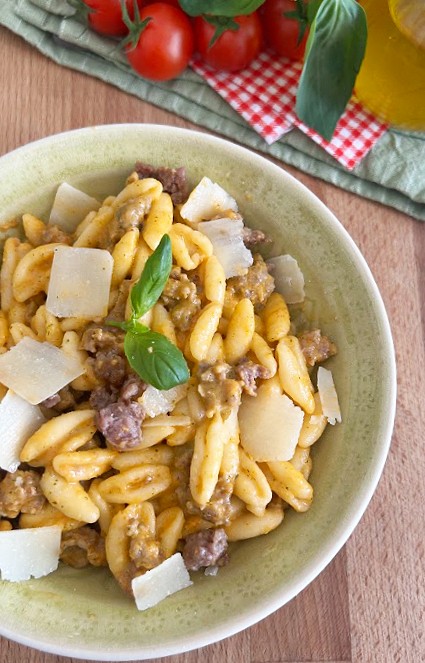 Giet de pasta af als deze al dente is en voeg deze direct toe aan de pan met de worst en de saus van cherrytomaatjes en burrata. Meng goed, voeg een beetje kookwater toe om het geheel te binden. Meng voorzichtig totdat de saus de pasta omhult. Serveer onmiddellijk, en maak het af met wat schilfers Parmezaanse kaas.