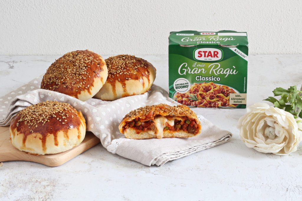 Wanneer het deeg is gerezen, rol het uit op een met bloem bestoven oppervlak en snijd stukken van ongeveer 70 g elk. Rol ze uit met je handen plat, plaats in het midden een royale lepel Il Mio Gran Ragù Star, voeg een stukje kaas toe en sluit de cirkel goed af, zodat de uiteinden goed aan elkaar kleven. Maak balletjes en laat ze rusten op een met bakpapier beklede bakplaat, bedekt met plasticfolie, voor minstens 30 minuten.
