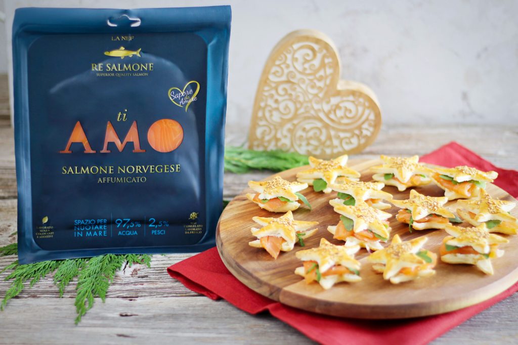 Eenvoudig te maken, deze heerlijke sterren ontstaan uit bladerdeeg dat met een vormpje wordt uitgestoken en vervolgens met ei wordt bestreken en met sesamzaad wordt bestrooid voor een krokante goudbruine kleur. De aldus verkregen korst bevat een zachte roomkaascrème, verrijkt met de verfijnde smaak van gerookte zalm. Om het geheel af te maken, wat blaadjes rucola die frisheid, kleur en een aangename textuurcontrasten geven.