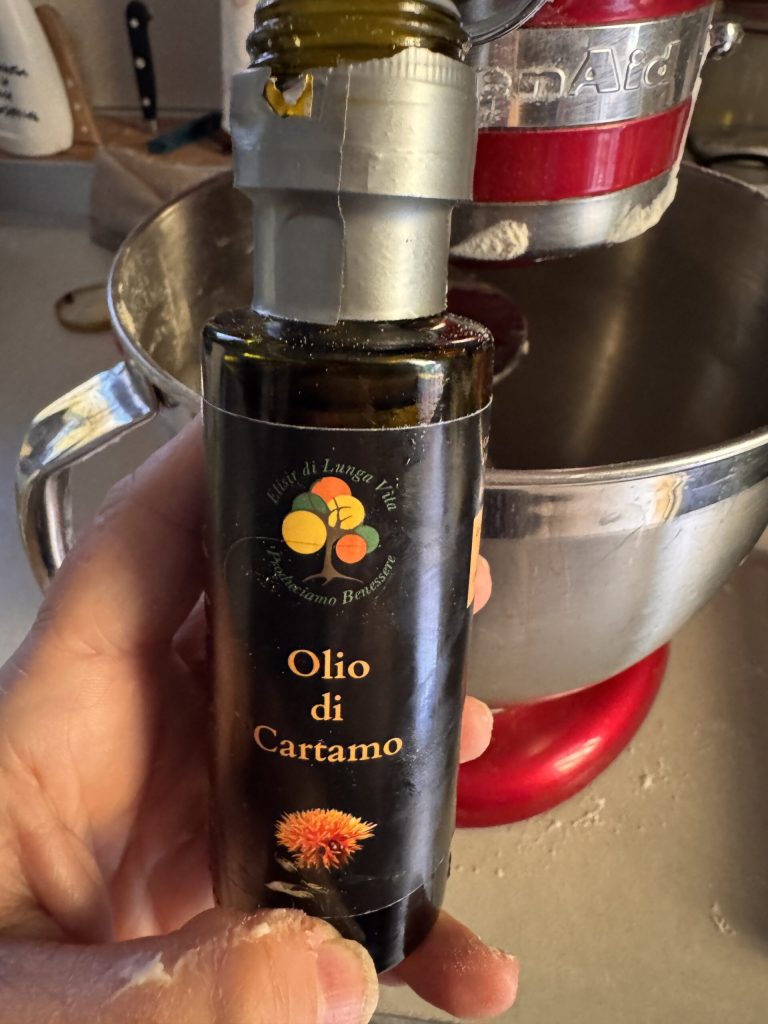 Neem op dit punt de olie. Ik heb de saffloerolie gebruikt, een hoog oleïnegehalte olie, ook gekregen voor de DivinMangiando in Tour. Het is gewonnen uit de plant Carthamus tinctorius, rijk aan meervoudig onverzadigde vetzuren en een natuurlijke bron van vitamines en mineralen, ideaal om het fysieke en mentale evenwicht op een natuurlijke en complete manier te ondersteunen.