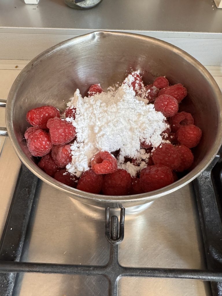 Voor de frambozensaus (of coulis) moet je de verse frambozen in een steelpan doen samen met de poedersuiker.