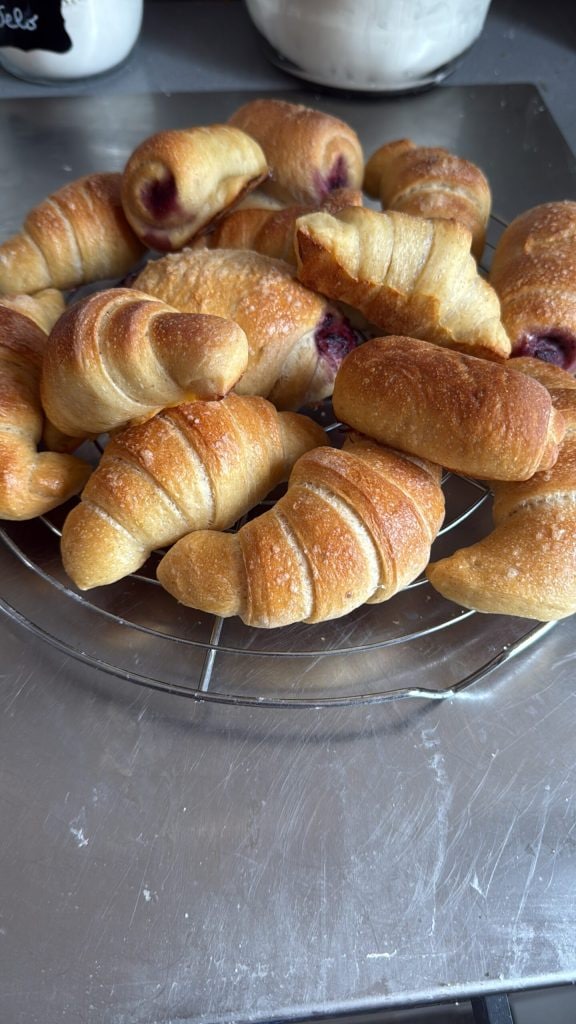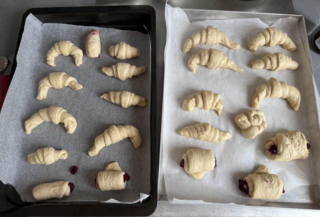 Plaats de croissants naarmate ze gevormd worden op twee bakplaten bekleed met bakpapier en houd voldoende afstand. Zoals je op de foto ziet, heb ik met de restjes kleine gebakjes gemaakt met marmelade om niets te verspillen!