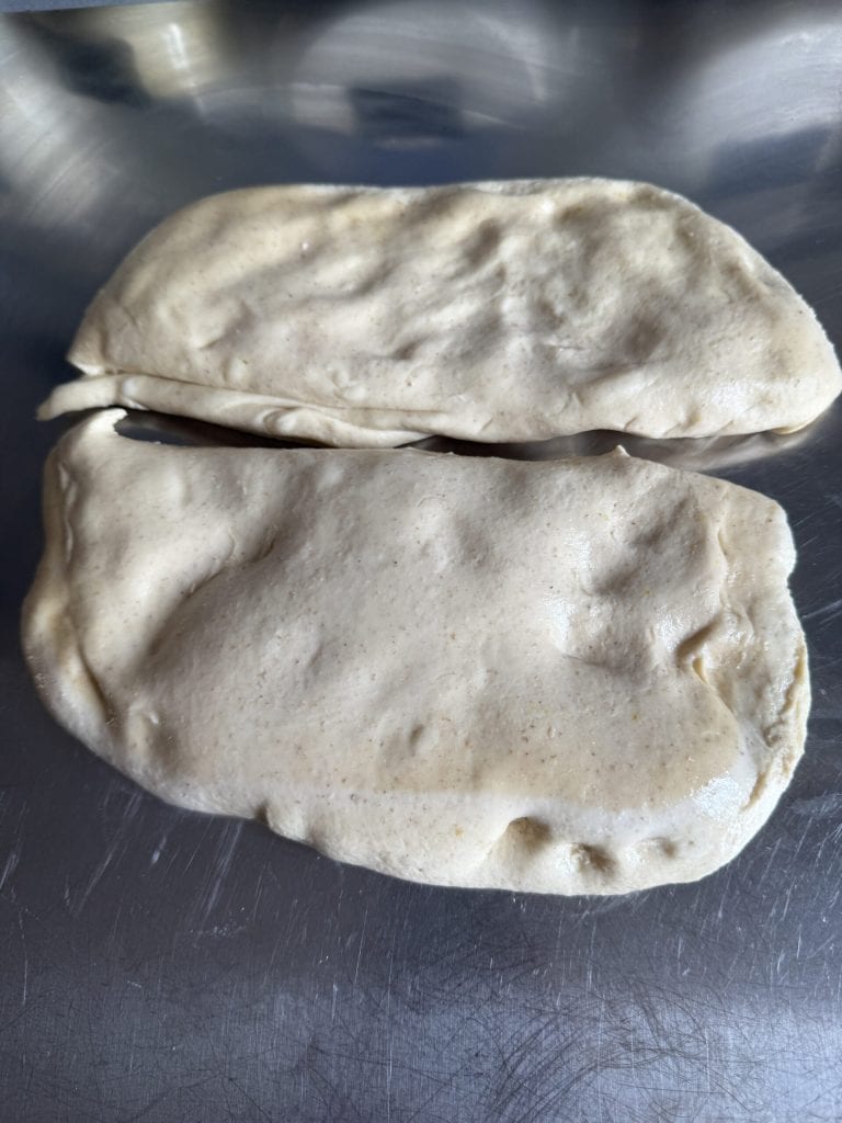 Druk het deeg plat op de werktafel en verdeel het met een deegschraper in twee delen.