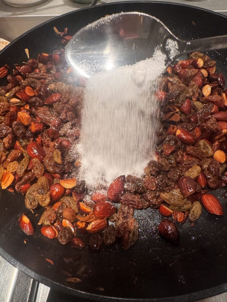 Ondertussen zijn de amandelen en rozijnen afgekoeld. Voeg wilde venkel en anijszaad toe en meng ze.