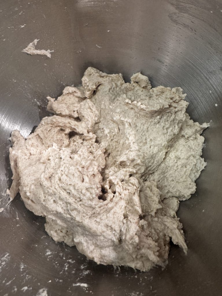 Zet de planeetmenger weer aan en voeg de “santi” toe in 3 of 4 delen om het deeg goed te laten opnemen. Verplaats het deeg naar het werkblad en laat het na een halfuur rusten, pirl het en plaats het in een container met deksel. Zet het ’s nachts in de koelkast.