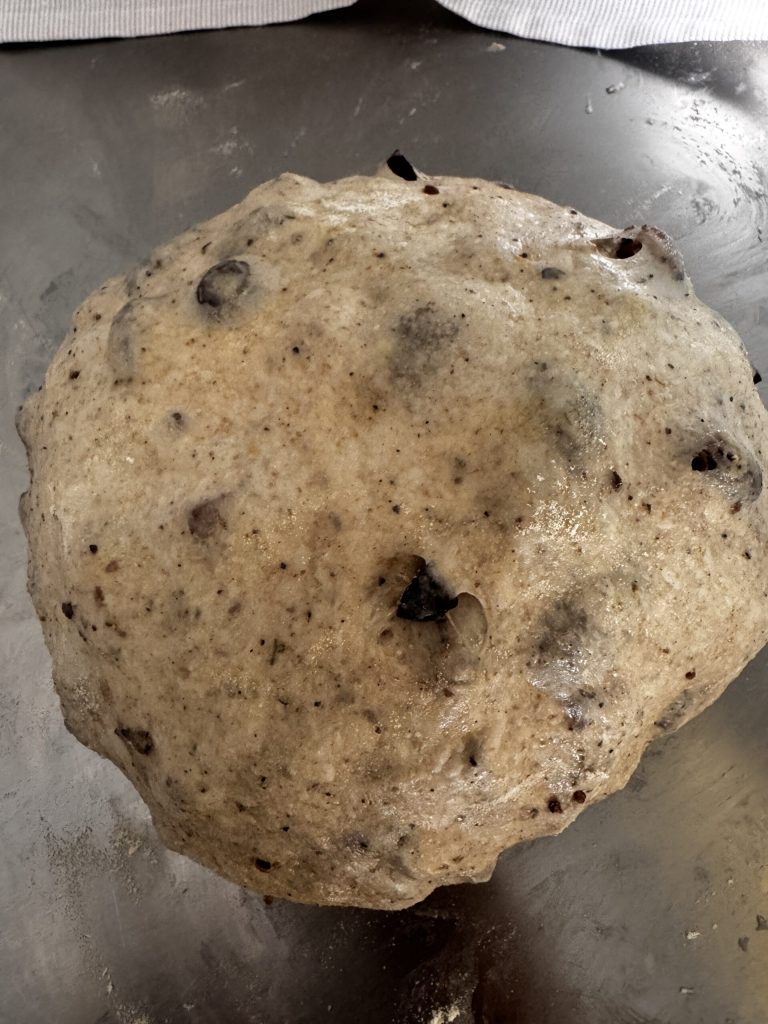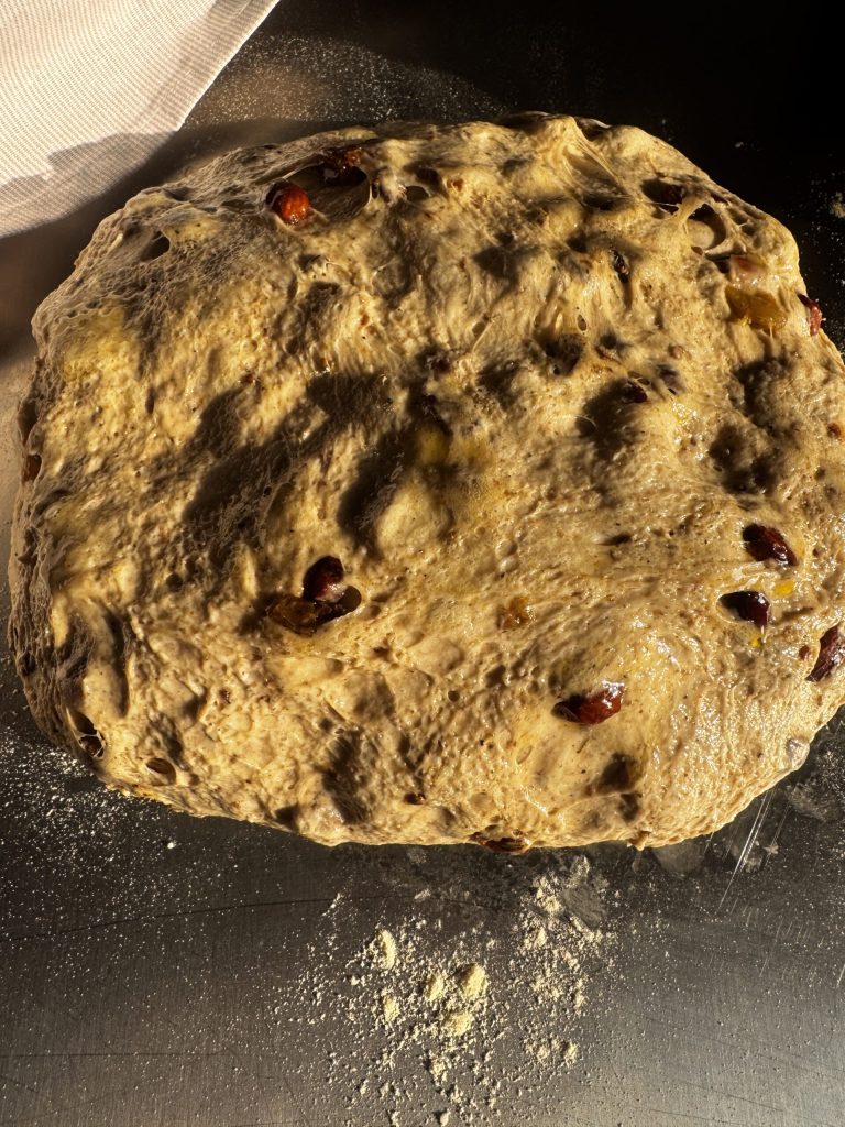 Het bereiden, vormen en bakken van Pan co’ Santi met zuurdesem is in feite als het maken van een ietwat rijker brood waaraan je kruiden, rozijnen en noten toevoegt. Een beetje arbeidsintensief maar niet moeilijk voor wie gewend is brood te bakken. Voor degenen die dat niet doen, is er alleen een beetje geduld en aandacht voor nodig, maar door de stappen te volgen, zal iedereen het kunnen maken! Ik geef de voorkeur aan het kneden met rozijnen en noten voordat het rust, maar velen doen deze stap nadat het deeg is verdubbeld.
