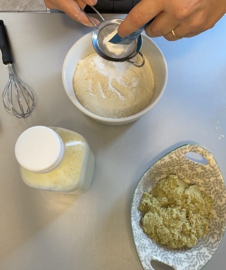Begin met het zeven van de bloem (ik koos voor type 0, maar type 1 of een volkorenmeel werkt ook) en meng met een half zakje bakpoeder, ook gezeefd. Meng de droge ingrediënten goed tot een homogeen mengsel.