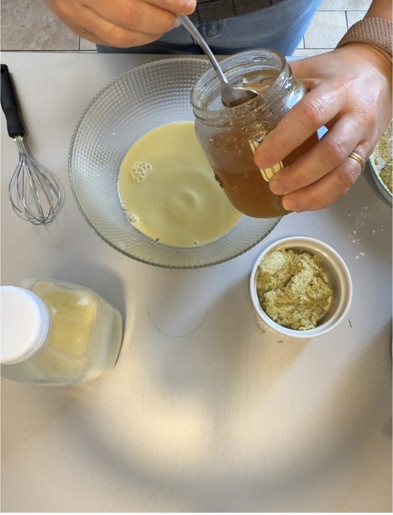 Mix de pistacheresten (okara) met de melk en honing, en meng goed tot een homogeen mengsel.