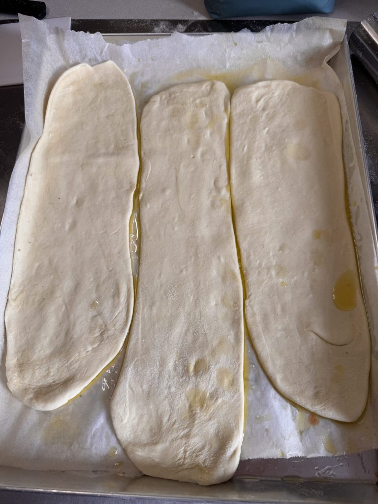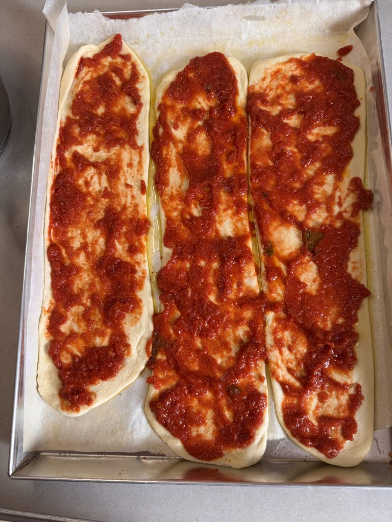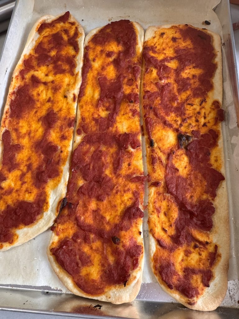 Rol de pizzatongen met desemstarter uit met de deegroller en trek ze een beetje uit. Leg ze op een bakplaat bedekt met bakpapier en olie. Dek ze af met huishoudfolie.