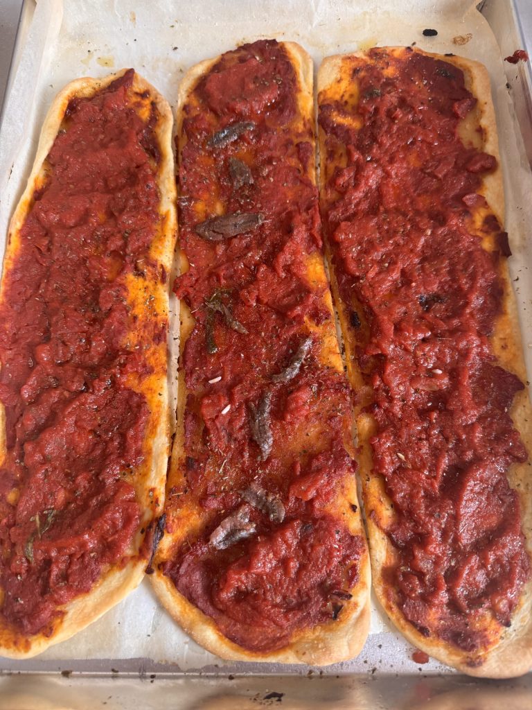 Na de baktijd haal je ze uit de oven, bestrooi ze met de resterende tomatensaus. Ik deed op sommigen wat ansjovisfilets. Doe een scheutje olie, bestrooi met oregano en zout en bak nog eens 5/10 minuten op 180 graden vlakbij de bovenkant van de oven.