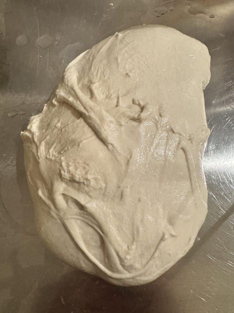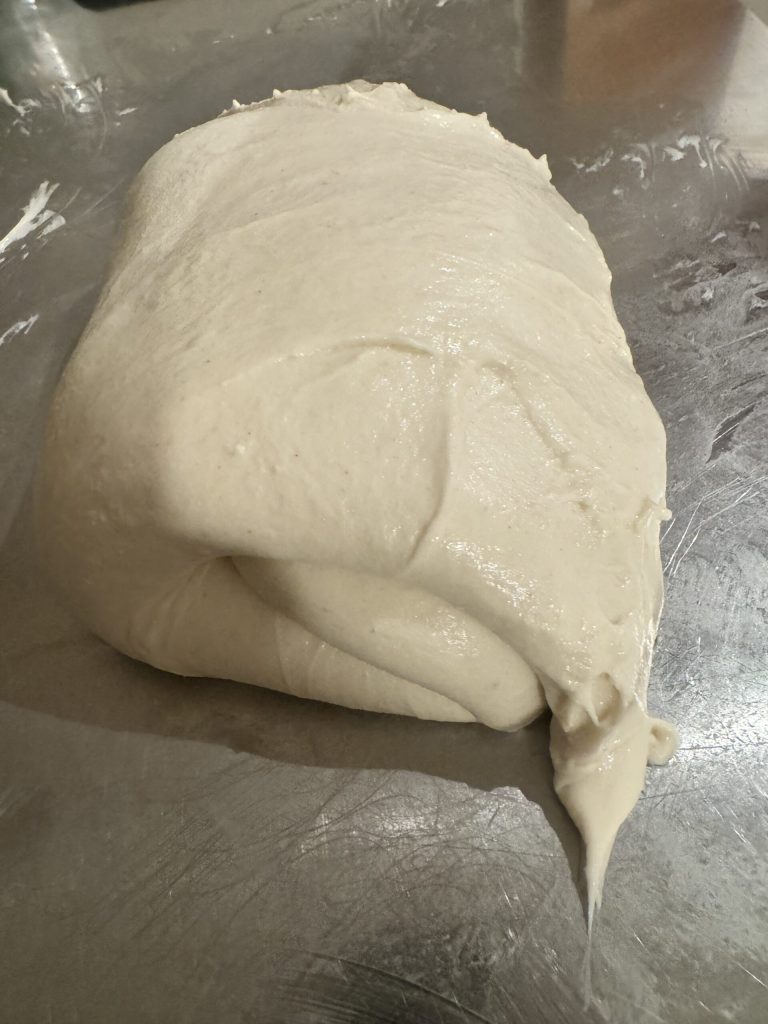 Keer het deeg op de stalen werkbank. Het zal erg plakkerig en enigszins onhandelbaar zijn… dat is normaal! Laat het een half uur rusten voordat je verdergaat met de vouwen.