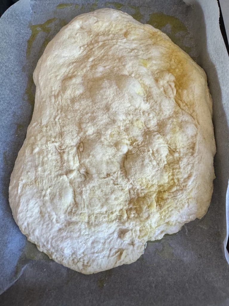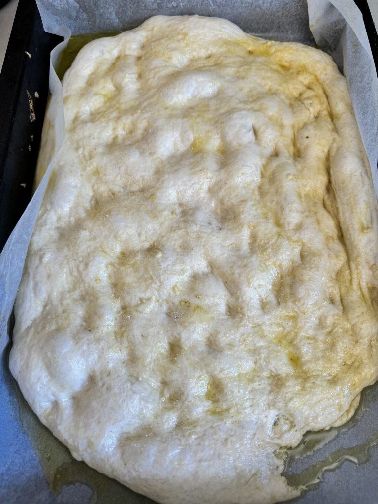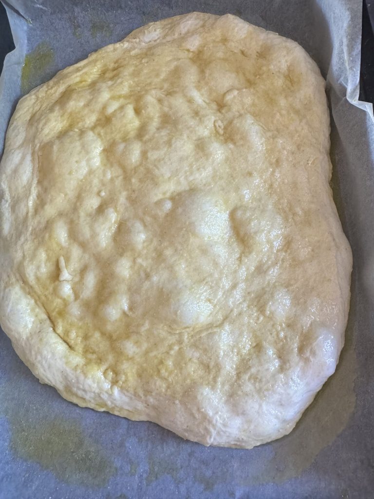 Eenmaal gerezen, moet het deeg mooi en opgeblazen zijn. Verwarm ondertussen de oven voor op 220 graden.