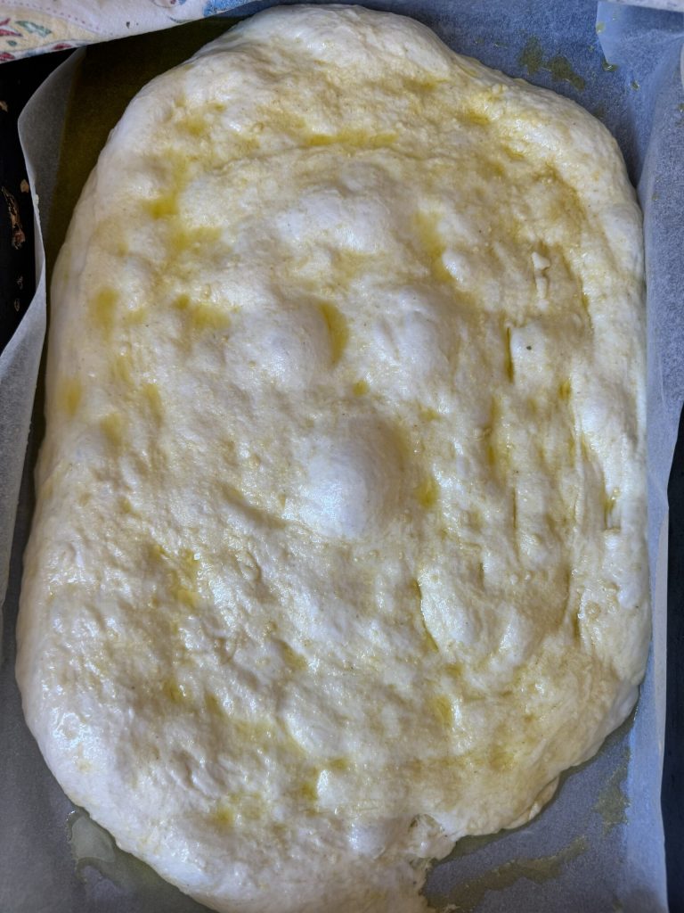 Om deze rode focaccia te maken, heb ik naast mijn zuurdesem Gino ook een mix van Molino Colombo gebruikt: de Focaccia Leggera die rijstgries en aardappelvlokken bevat, waardoor het zacht en krokant tegelijk is. Om het resultaat van de mix te benaderen, kun je 50 g van het totale gewicht van de bloem aftrekken en de helft rijstbloem en de helft opnieuw gemalen gries toevoegen.