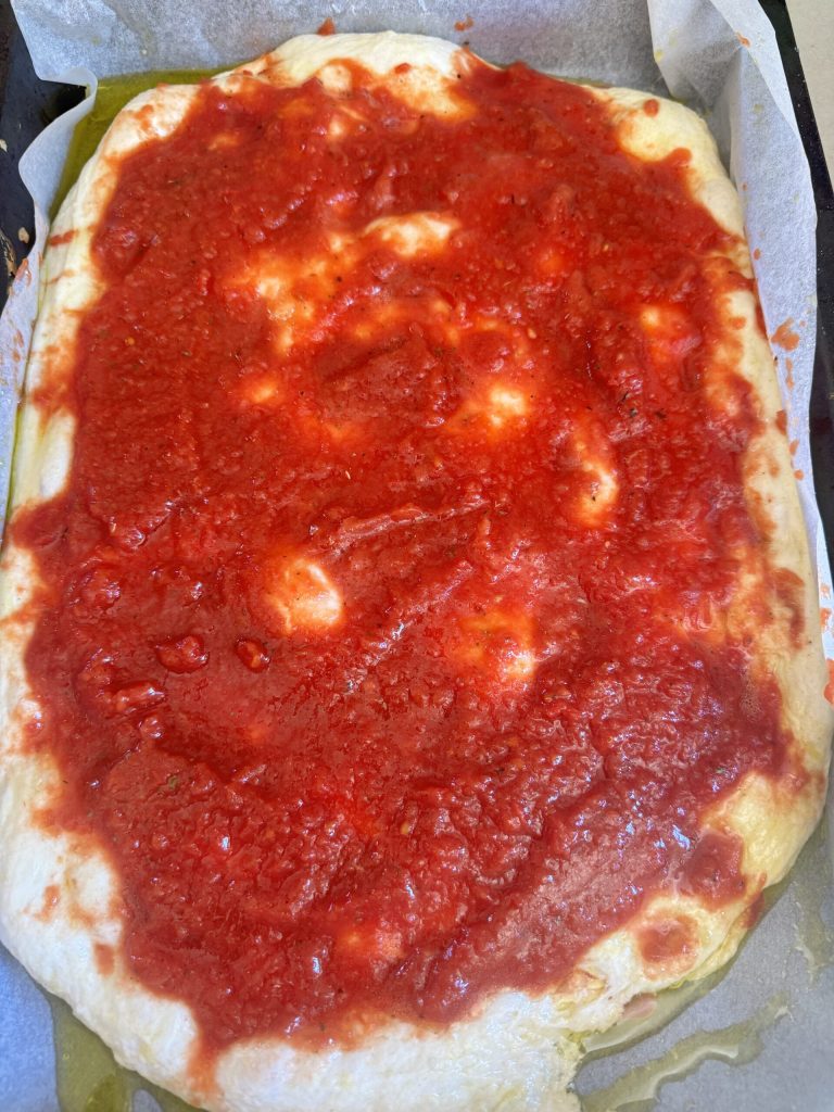 De volgende ochtend het deeg uit de koelkast halen en het een paar uur laten acclimatiseren (afhankelijk van de buitentemperatuur) en ondertussen de saus voorbereiden.