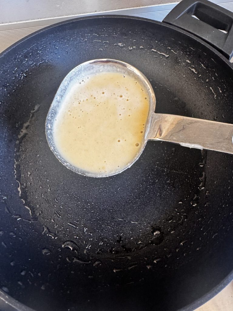 Verspreid het beslag voorzichtig met behulp van de pollepel over het gehele oppervlak van de pan.