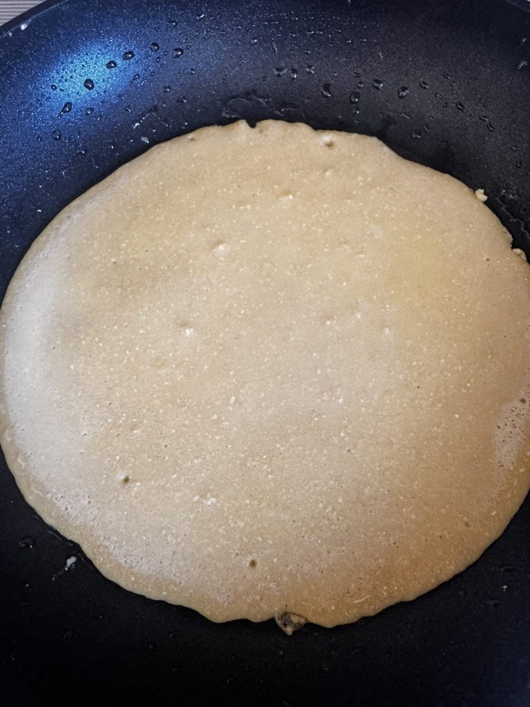 Draai het beslag voorzichtig om met een spatel en laat de andere kant bakken.