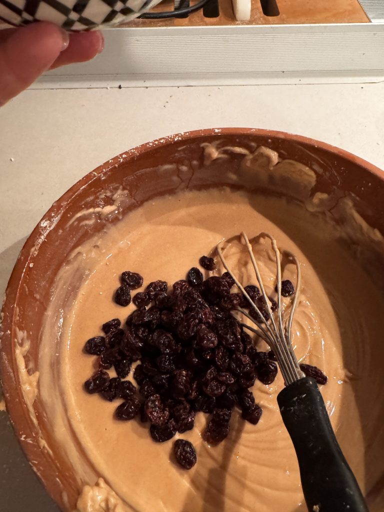 • Knijp de rozijnen uit en voeg 50 gram toe aan het deeg. Meng het goed.
