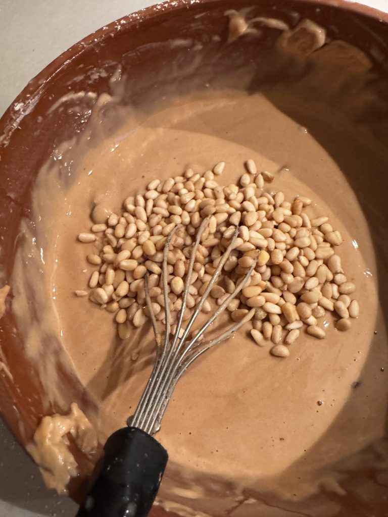 • Blijf roeren tot de pijnboompitten en rozijnen zijn opgenomen.
