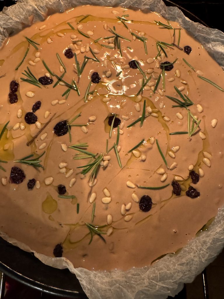 • Bestrooi met rozijnen en pijnboompitten en besprenkel met olie.