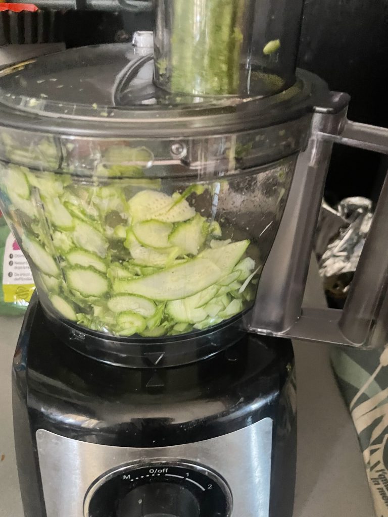 • Bedek met een bord en een gewicht om zoveel mogelijk water uit de groenten te halen. Deze essentiële stap kan duren van minimaal een uur tot twee/drie afhankelijk van hoe “waterig” de courgettes zijn.