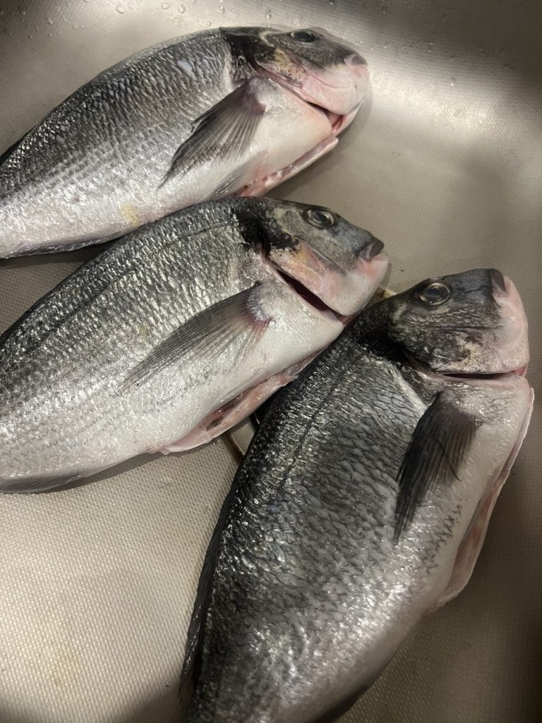 Eerst moeten de dorades schoongemaakt worden (of door de visboer laten schoonmaken). Je moet een snede maken aan de onderkant en de ingewanden verwijderen. Ook schubben we ze met een mesje door het mes over het hele oppervlak te halen. Spoel ze heel goed af onder stromend water.
