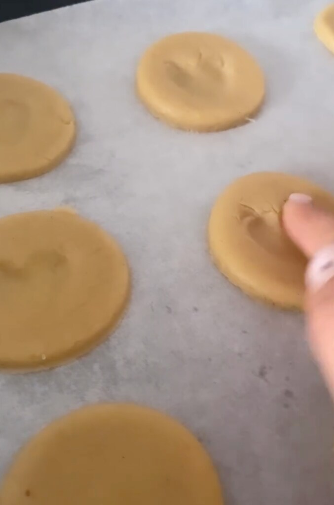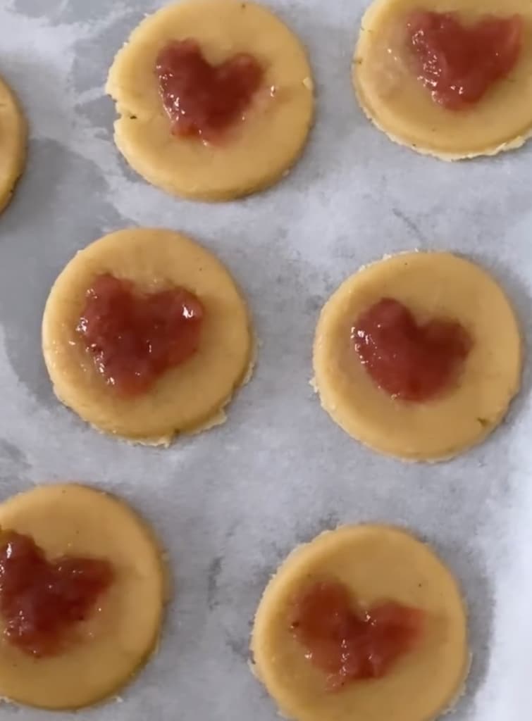 Rol het deeg uit op een bakplaat met behulp van bakpapier en snijd de koekjes met een glas. Vorm met de punt van je vinger kuiltjes in de koekjes en vul deze vervolgens met een theelepel jam.