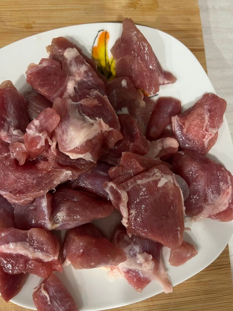 • 1. Snijd de stukjes in kleine stukjes, volgens de gewenste grootte, en verwijder het overtollige vet met een mes. Ik raad aan om stukjes van 2 centimeter te maken, dit versnelt de kooktijd.