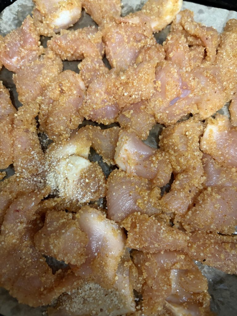 • Leg een speciale (geperforeerde) bakpapier in het mandje van de airfryer, of je kunt het papier weglaten en de stukjes direct op het rooster leggen. Zorg ervoor dat je ze niet over elkaar heen legt.