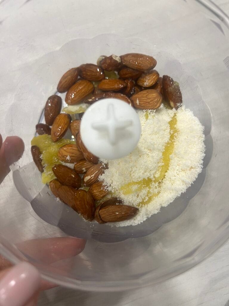 In de mixer doen we de schil van een halve citroen (zonder het witte gedeelte), citroensap, Parmezaanse kaas, olie en amandelen en mixen we alles tot een pasta.