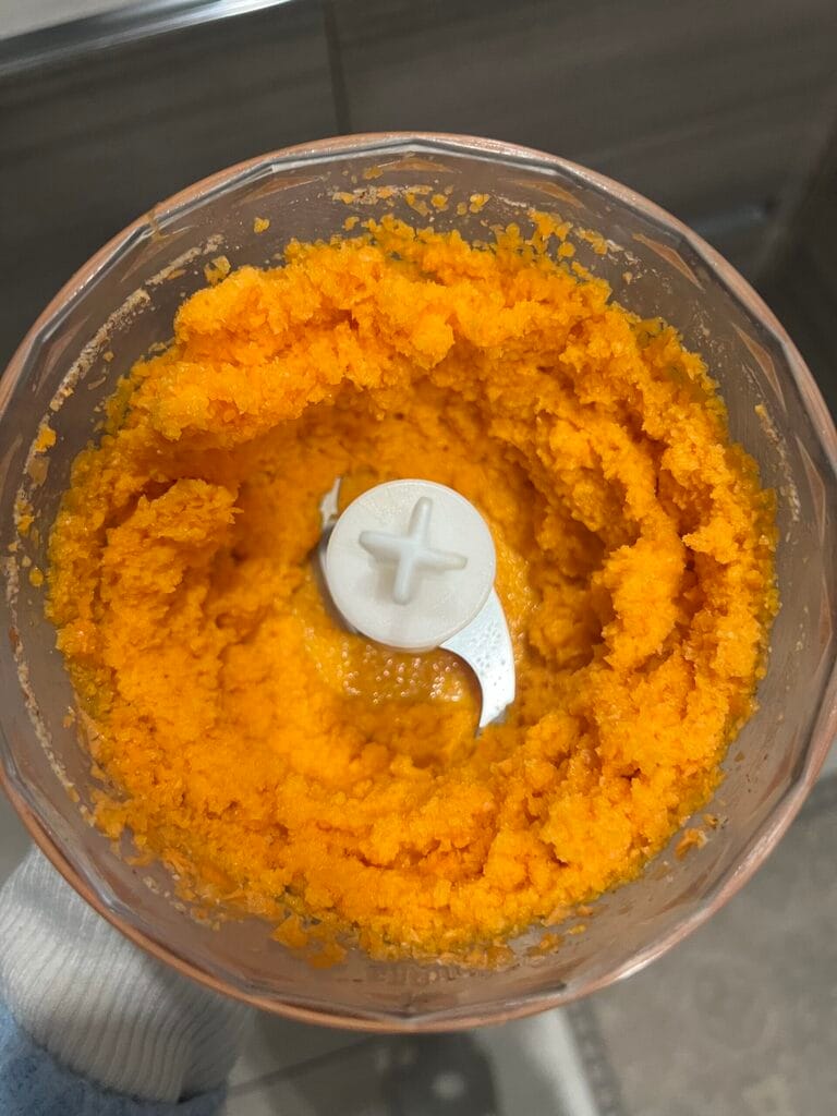 • We beginnen met het wassen en schillen van de wortelen. In de mixer malen we de amandelen tot poeder (als we geen amandelmeel hebben) en zetten we ze apart. Snijd de wortelen in stukjes en doe ze in de mixer, met de helft van de zonnebloemolie, zodat we een mooi glad mengsel krijgen.
