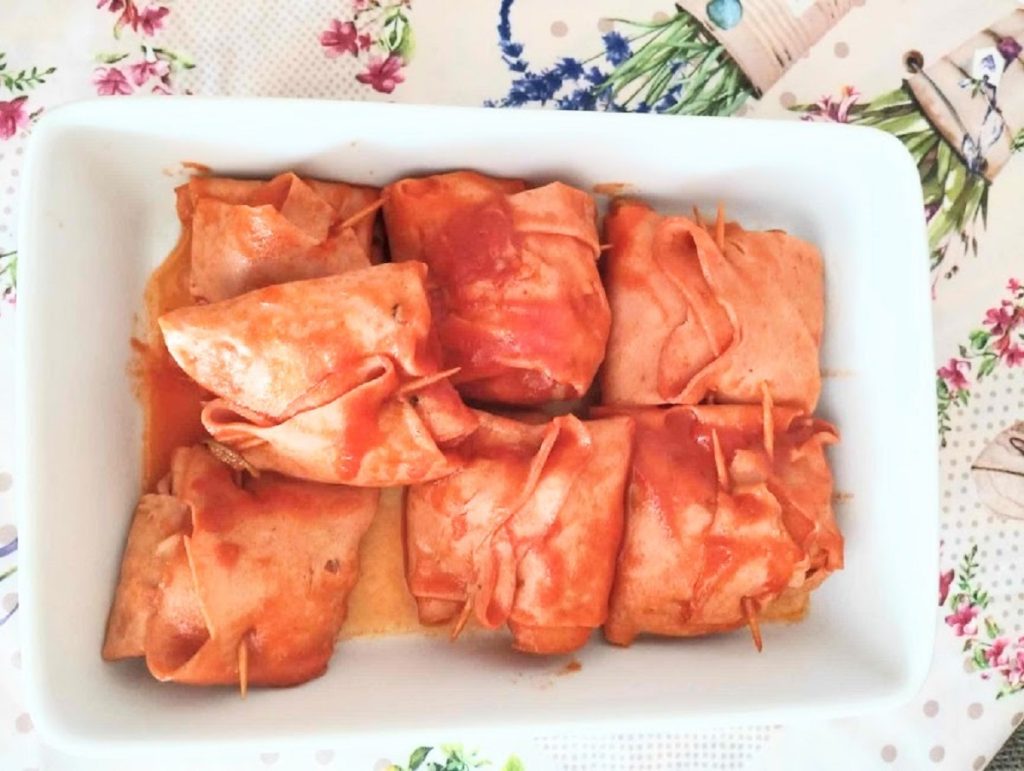 Leg de plakjes mortadella neer en leg in het midden van elk plakje de vulling, rol ze op zodat de vulling er niet uitkomt en sluit ze met een houten prikkertje. Plaats de rolletjes in de tomatensaus en laat het totaal ca. dertig minuten verder koken.