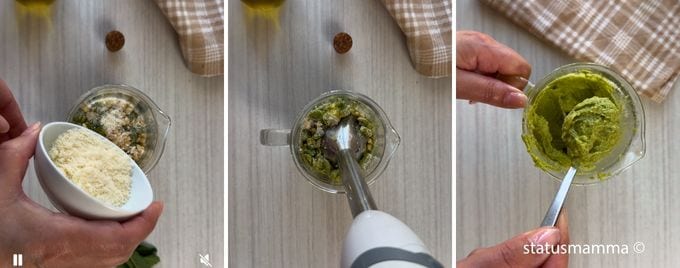 Doe de tuinbonen in een mixer en mix met extra vergine olijfolie, pecorino, pijnboompitten, enkele blaadjes munt en een snufje peper. Voeg indien nodig een beetje pastakookwater toe om een romige consistentie te bereiken.3. Maak de spek krokant