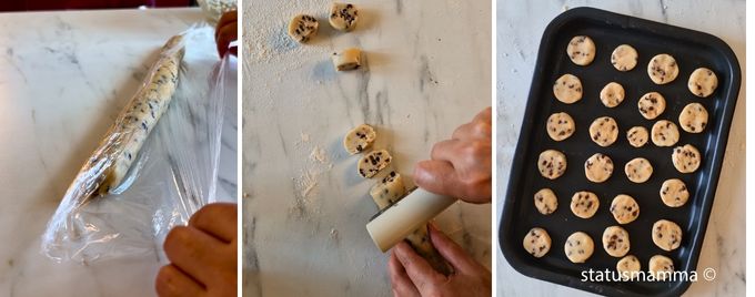 6. Vorm rolletjes van 5 cm breed en 1 cm dik. Laat een uur rusten in de koelkast, gewikkeld in plasticfolie. Snijd vervolgens rondjes van 1 cm dik en leg ze op een bakplaat bedekt met bakpapier, zorg ervoor dat er ruimte is tussen de koekjes.