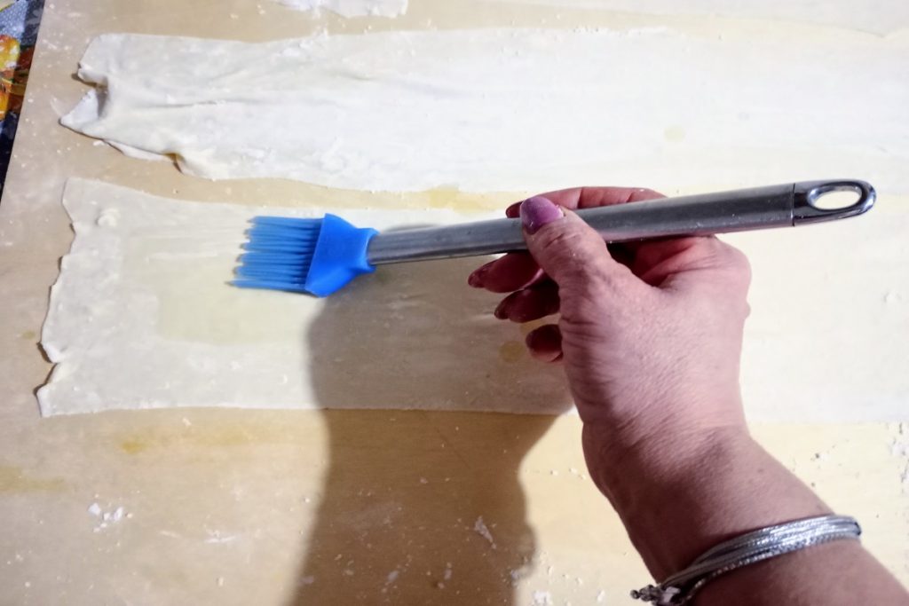 Het wordt bereid met lagen filodeeg die worden bestreken met gesmolten boter en vervolgens gevuld, gesloten en opgerold als een rolletje.