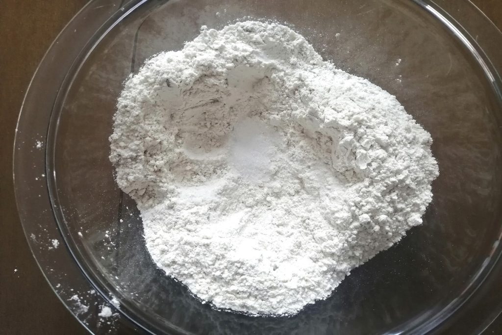 Voeg het zout en de suiker toe aan het meel. (Als je gist gebruikt, voeg het zout dan toe nadat je begint te kneden, de gist mag niet in contact komen met het zout)