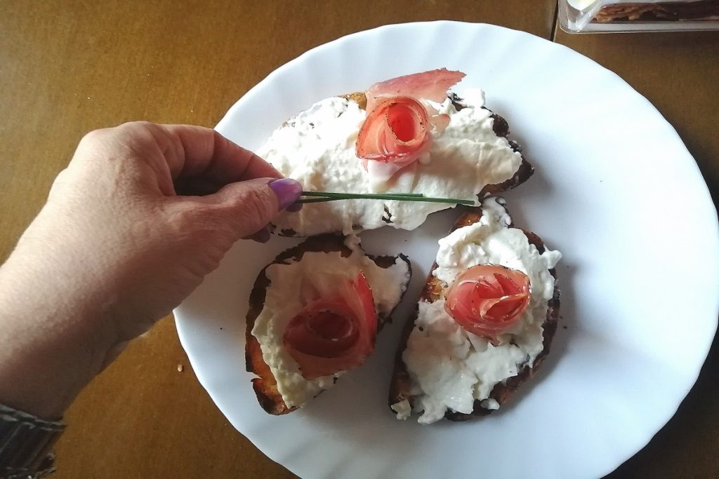 Rol het plakje speck op tot een roosje en leg het in het midden van de bruschetta.