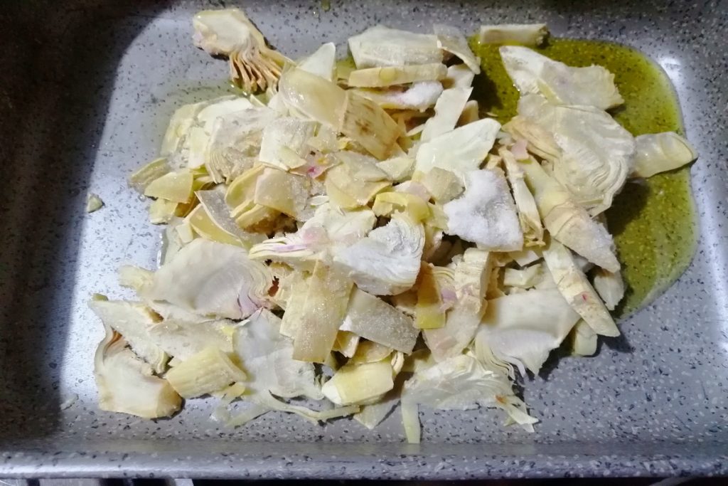 • In een pan doen we wat extra vierge olijfolie en de knoflook om het te bruinen, voeg de schoongemaakte artisjokken toe.